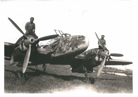 Sylvain Smadja sur le moteur gauche d'un Messerchmidt 110 en Avril 1945 en route vers le nid d'aigle de Hitler à Berchtesgaden en Bavière
