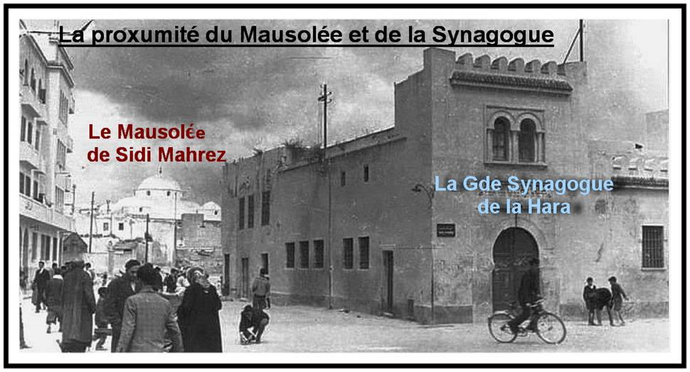 • Plus tard, les juifs demandèrent de bâtir un lieu de prière, Sidi Mahrez accepta , il posa 2 conditions, La Synagogue sera visible de son mausolée et la seconde qu'elle ne soit pas plus haute que les maisons arabes qui l'avoisinaient. Alors, du haut de son grand monument, il lança son bâton et dit " "là ou tombera le bâton vous bâtirez votre Temple". Les juifs virent que cette hauteur ne permettra point de construire leur temple et eurent l'idée de prendre la hauteur nécessaire en abaissant la hauteur de parterre, de près de 3 mètres, en dessous du niveau de la rue. La Synagogue pourra être plus grande et aurait des colonnes et des arcs, et, l'entrée se fera en descendant les marches. Durant les siècles qui passèrent et avec la construction de plusieurs autres synagogues, elle resta la première et la grande synagogue de la Hara