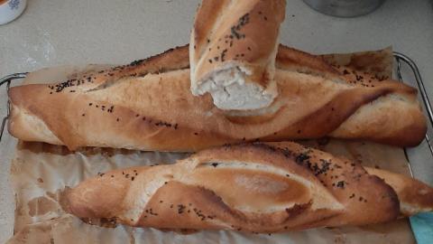 Partager la pâte en 4 (ou 5 morceaux). Aplatir chaque morceau au rouleau en forme rectangle d'une épaisseur de 2 cm. Rouler comme un boudin en diagonal et faire de entailles sur le dessus. Placer sur des plaques de cuisson ou encore mieux sur des moules à baguette.